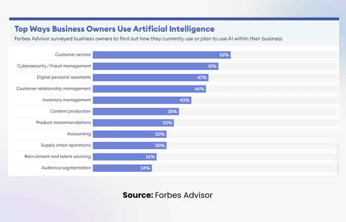 Businesses have now started using AI to improve and perfect operations. As per one Forbes Advisory survey, 56% of respondents admitted the use of AI in customer service, the highest adoption rate. 51% of the respondents also accepted the use of AI for cybersecurity and fraud management.
