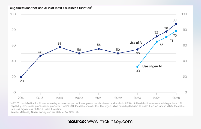 According to McKinsey’s 2025 global survey on AI adoption, over 88% of organizations report using AI in at least one business function, up from roughly one-third in 2023.